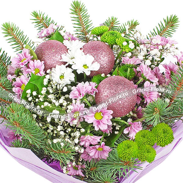 ДЕЛЮКС: хризантема белая ромашковидная - 6 шт., хризантема розовая ромашковидная - 8 шт., хризантема зеленая (сантини) - 6 шт., гипсофила - 7 шт., еловая ветвь, новогодний декор и зелень, фетр.